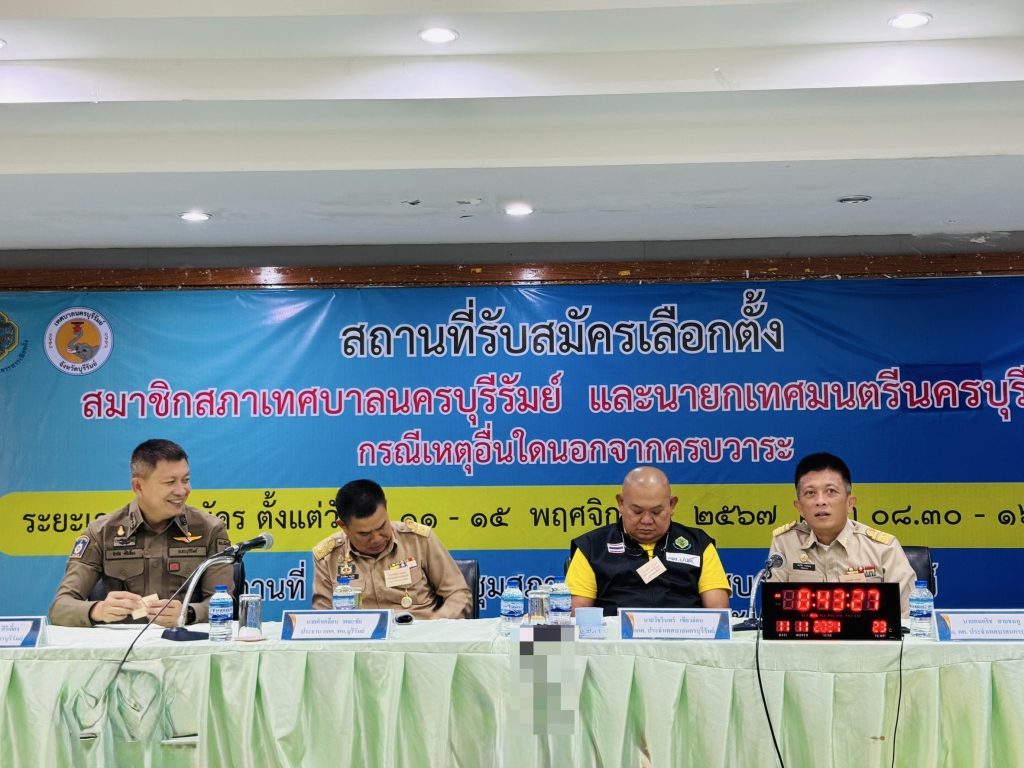 พร้อมด้วยข้าราชการตำรวจ สภ.เมืองบุรีรัมย์ ปฏิบัติหน้าที่รักษาความปลอดภัย สถานที่รับสมัครเลือกตั้งสมาชิกสภาเทศบาลนครบุรีรัมย์ และนายกเทศมนตรีนครบุรีรัมย์ กรณีเหตุอื่นใดนอกจากครบวาระ ระยะเวลารับสมัครตั้งแต่วันที่ 11-15 พฤศจิกายน 2567 เวลา 08:30 -16:30 น.