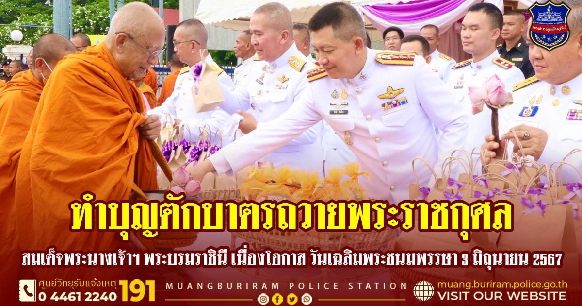 พล.ต.ต.รุทธพล เนาวรัตน์ ผบก.ภ.จว.บุรีรัมย์ พร้อมด้วย พ.ต.อ.จำรัส ศิริเลี้ยง ผกก.สภ.เมืองบุรีรัมย์ และข้าราชการตำรวจในสังกัด ภ.จว.บุรีรัมย์ ร่วมพิธีทำบุญตักบาตรถวายพระราชกุศล สมเด็จพระนางเจ้าฯ พระบรมราชินี เนื่องโอกาส “วันเฉลิมพระชนมพรรษา 3 มิถุนายน 2567” โดยมี นายนฤชา โฆษาศิวิไลซ์ ผวจ.บุรีรัมย์ เป็นประธานในพิธี ณ บริเวณลานด้านหน้าศาลากลางจังหวัดบุรีรัมย์ (หลังเดิม) อ.เมือง จ.บุรีรัมย์