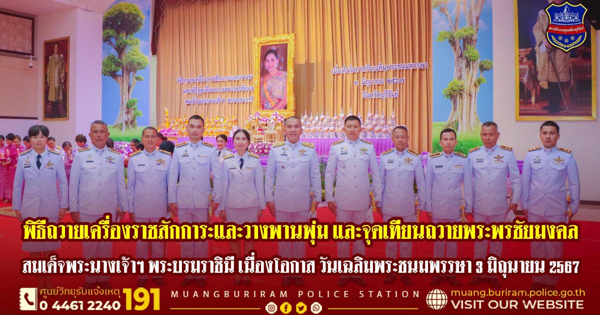พล.ต.ต.รุทธพล เนาวรัตน์ ผบก.ภ.จว.บุรีรัมย์ พร้อมด้วย พ.ต.อ.จำรัส ศิริเลี้ยง ผกก.สภ.เมืองบุรีรัมย์ และข้าราชการตำรวจในสังกัด ภ.จว.บุรีรัมย์ ร่วมพิธีถวายเครื่องราชสักการะและวางพานพุ่ม และจุดเทียนถวายพระพรชัยมงคล สมเด็จพระนางเจ้าฯ พระบรมราชินี เนื่องโอกาส“วันเฉลิมพระชนมพรรษา 3 มิถุนายน 2567“ โดยมี นายนฤชา โฆษาศิวิไลซ์ ผวจ.บุรีรัมย์ เป็นประธานในพิธี ณ หอประชุมจังหวัดบุรีรัมย์ ศูนย์ราชการจังหวัดบุรีรัมย์