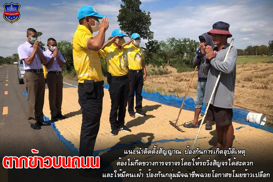 สภ.เมืองบุรีรัมย์ ออกประชาสัมพันธ์การตากข้าวเปลือกบนพื้นผิวจราจร แนะนำติดตั้งสัญญาณ ป้องกันการเกิดอุบัติเหตุ ต้องไม่กีดขวางการจราจรโดยให้รถวิ่งสัญจรได้สะดวก และให้มีคนเฝ้า ป้องกันกลุ่มมิจฉาชีพฉวยโอกาสขโมยข้าวเปลือก