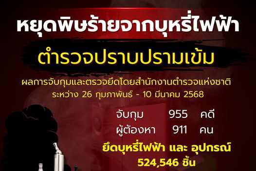 สำนักงานตำรวจแห่งชาติปราบปรามเข้ม จับกุมตรวจยึดอย่างต่อเนื่องกว่า 2 สัปดาห์ ยึดบุหรี่ไฟฟ้าและอุปกรณ์
