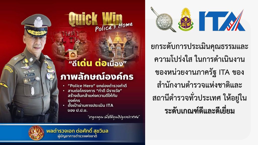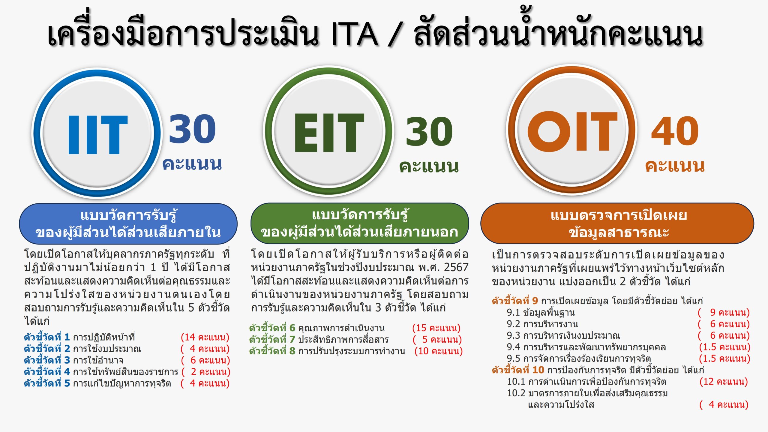 ITA เป็นการประเมินหน่วยงานภาครัฐทั่วทุกแห่งในประเทศไทย เกี่ยวกับคุณลักษณะด้านคุณธรรมและความโปร่งใสในการดำเนินงานทุกมิติซึ่งเปรียบเสมือนการตรวจสุขภาพองค์กรประจำปีโดยผลที่ได้จะนำไปปรับปรุงพัฒนาองค์กรในปีงบประมาณถัดไป