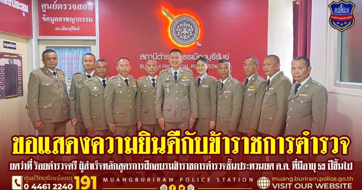 🔸พ.ต.อ.จำรัส ศิริเลี้ยง ผกก.สภ.เมืองบุรีรัมย์ มอบเครื่องหมายประดับยศให้แก่ข้าราชการตำรวจยศว่าที่ ร้อยตำรวจตรี ผู้สำเร็จหลักสูตรการฝึกอบรมข้าราชการตำรวจชั้นประทวนยศ ด.ต. ที่มีอายุ 53 ปีขึ้นไป พร้อมได้กล่าวอวยพรให้ประสบแต่ความสุขความเจริญในชีวิตและหน้าที่การงานต่อไป